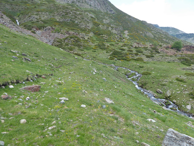 Más arriba, ya transformado en senda, sale a unos prados bastante por encima del cauce, desde donde se veía ya el Pic de Qüenca, contrastando su palidez caliza con el verdor del valle. También, fijándose un poco a la derecha de la peña, se distinguían los tejados de las Bordes de Moredo, fin de la primera parte de la ascensión.